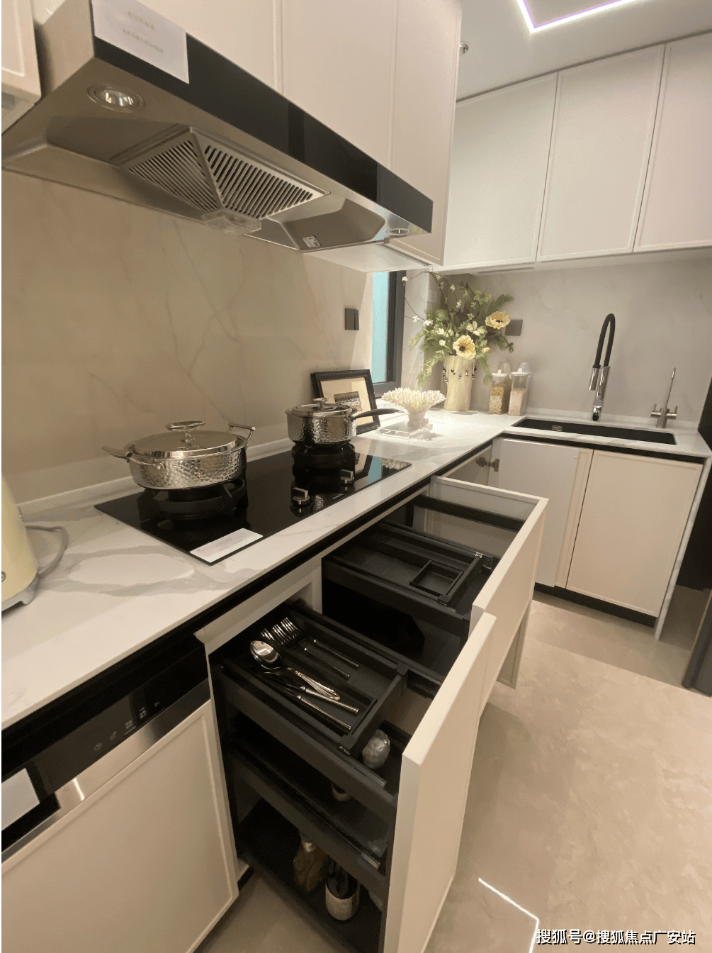 柜门白色烤漆面板,抽屉分区也都是帮大家细致划分,如多功能调味拉篮+谷物抽+碗碟拉篮等。岛台上配置可升降插座,铝合金抽屉,石材背景板的金属开放格实用性很强。