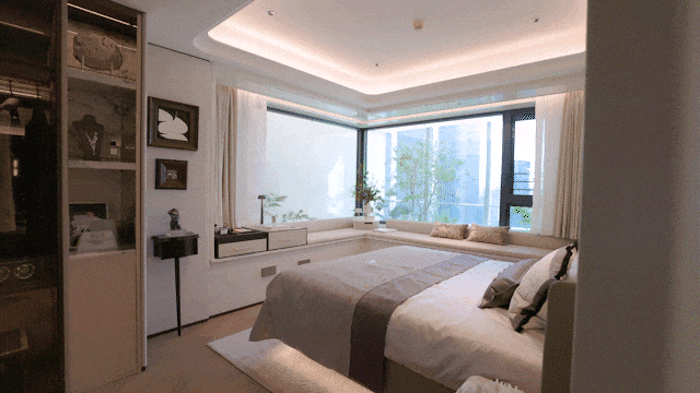 主卧约270°L形飘窗设计,将窗外的美景尽收眼底,注重美观的同时,也兼顾了实用性与舒适性,让业主在繁忙的生活中也能享受到宁静与安逸。