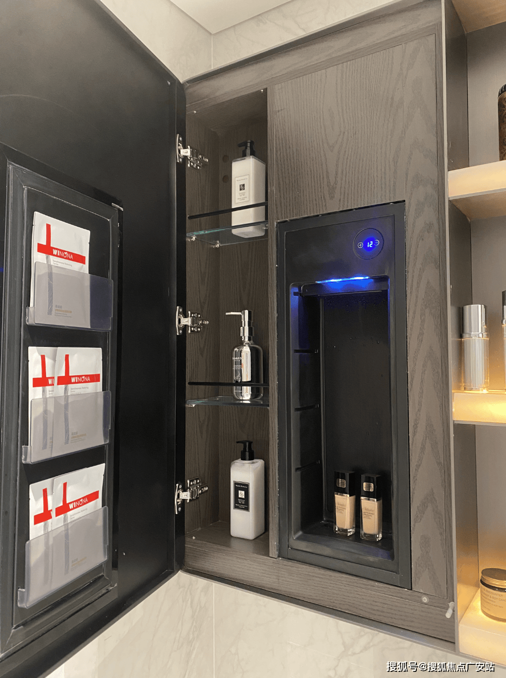 奢石台面,皮革饰面柜抽屉,侧端设置金属收纳开放格;定制镜柜,中间的透光玉石直接提升了高级感,镜柜内部配备了美妆冰箱+美妆灯条+轨道收纳!