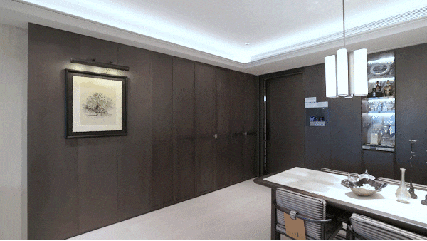 如果说吊顶是建筑的皮肤,那么墙壁便是灵魂的铠甲。卧室区域外,除了s空间,墙壁均为木饰面+岩板,并且