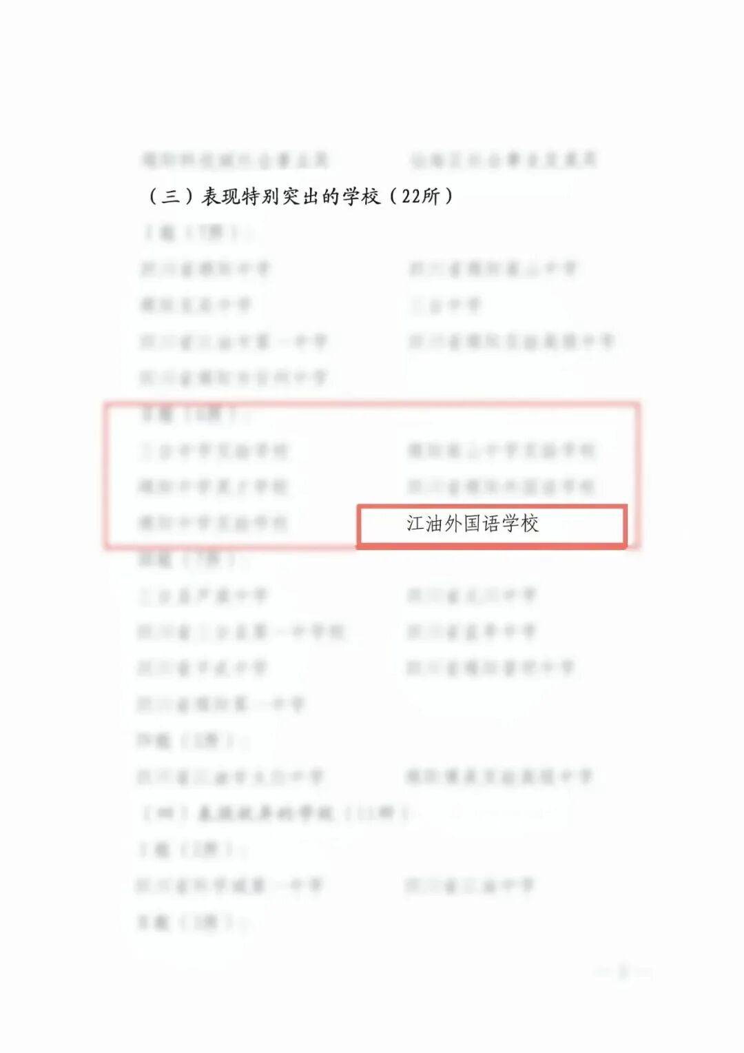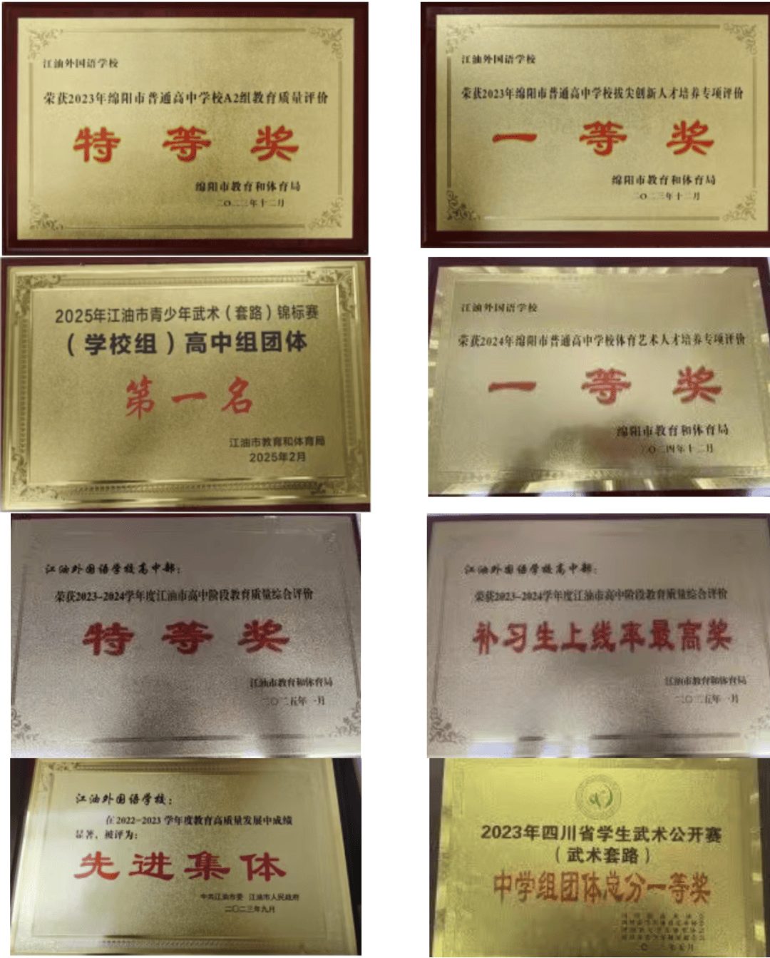 学校接连斩获绵阳市普通高中学校A2组教育质量评价最高奖(特等奖)、绵阳市拔尖创新人才培养专项评价一等奖、绵阳市体育艺术人才培养专项评价一等奖,被评为绵阳市强基人才培养表现优异学校,并多次摘得江油市高中教育质量评价特等奖、特优生贡献奖。