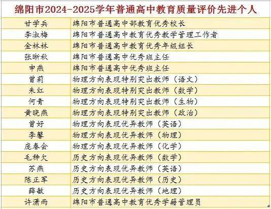 这支队伍包含38名毕业于清华、北大的优秀师资,40名省市级骨干教师,35名高级教师,22名一级教师。在近年绵阳市高中教育质量评价中,获特等奖教师36人,获一等奖教师16人;参加省市级教学技能大赛,60余名教师荣获市级以上奖励。