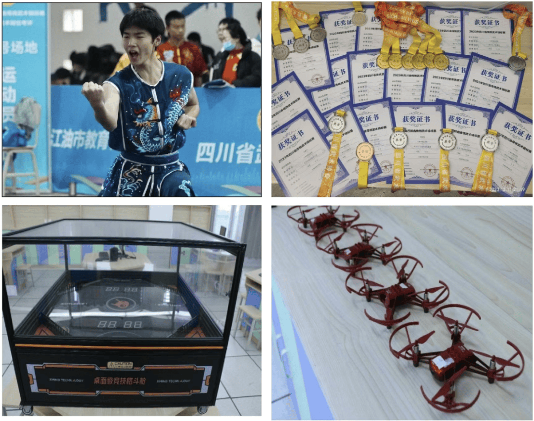 仅2025年,学校在绵阳市第八届运动会,牵头的乒乓球队夺冠,武术队夺冠;全国武术比赛,尚宇涛、张子淏同学捧回一等奖;庹尹亭同学站上“绵阳市十佳歌手”的领奖台;杨镒溢同学在绵阳市“用英语讲好中国故事”演讲比赛中拿下一等奖,又在江油市主持人大赛中获得特等奖;刘倍辰、莫佳琦、刘剑锋、张杰茗等同学在市主持人大赛、演讲比赛等活动中屡获佳绩;宋俊锐、王艺杰、郭子涵、彭雨馨、周子玥、刘天翼等多名同学在各级体育赛事中夺得优异名次......