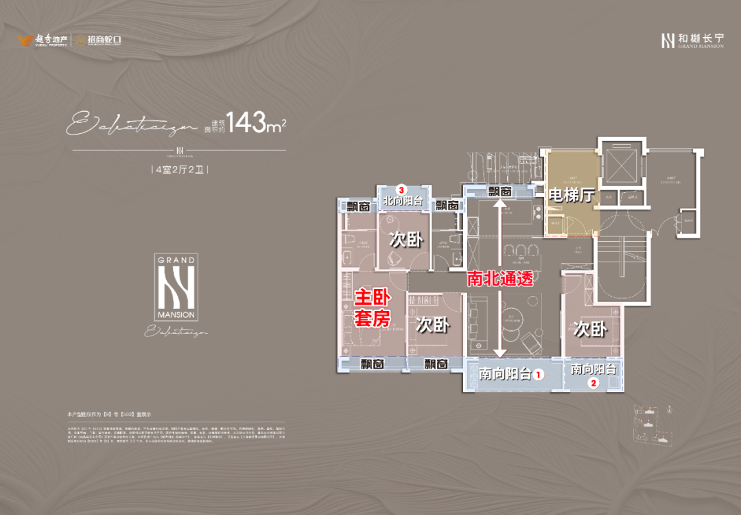 项目建面约143㎡户型的设计无疑是市场一流水准,一梯一户保证私密性和尊崇感;四开间朝南+大宽厅,采光效果爆棚;主卧贯穿南北套房设计,南北都有飘窗,舒适度可圈可点。